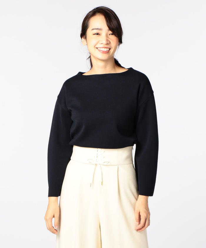 ほど良い張り感を持つ、しなやかな薄手の編み地が快適な着心地をもたらしてくれるプルオーバーニットです。すっきりとした首周りの印象を演出するボートネックと、エフォートレスな魅力を引き出してくれるドロップショルダー、ベルスリーブのクラシカルなディテールを組み合わせた、絶妙なバランスが特徴の一枚です。