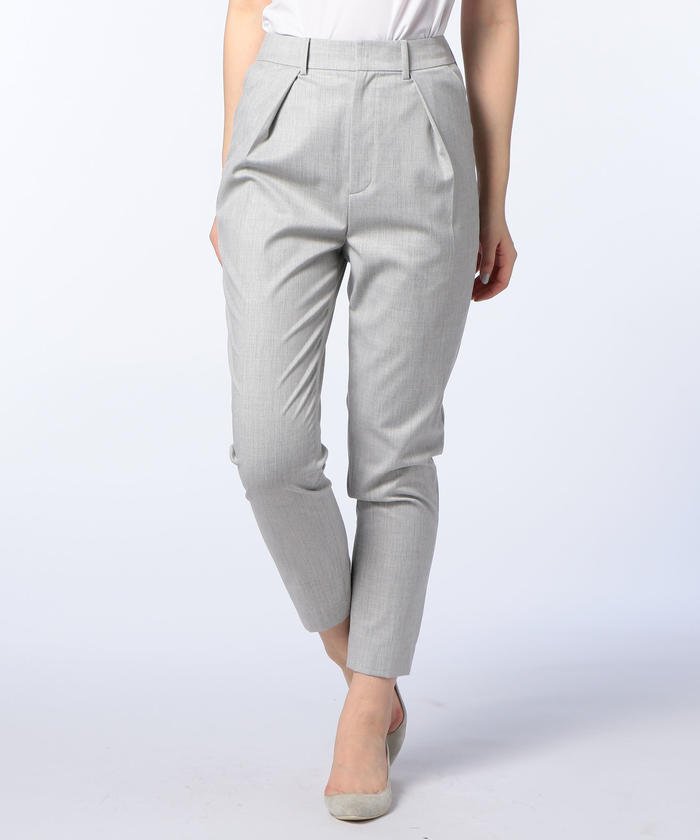 タックを入れることでややゆとりのあるシルエットに仕上げたパンツ。レーヨンを混紡した素材で春夏シーズンに最適です。ハイウエストのデザインはどんなトップスとも合わせやすいのが魅力。ポケットを配したのみのシンプルなデザインで、オフィスシーンにも相性のよい1本です。