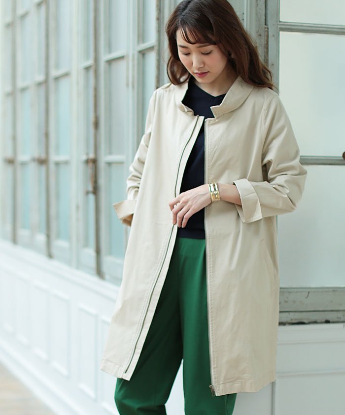 スッキリしたデザインながら、オリジナリティのあるスタンドネックも首もとのデコルテを綺麗に見せるポイント。ジップアップして着た際も首が詰まらず抜け感があり春の装いにピッタリ。
