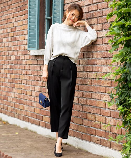 ほんのり光沢感のある上品なお素材で、シンプルなのにオシャレな雰囲気が漂うパンツ。トップスにはシンプルなものを持ってきても、スタイリッシュにキメてくれます。ニットやシャツを合わせても、カジュアルでありながら品もあり、大人の女性に似合うコーディネートに仕上げてくれます。シルエットは太ももまわりにゆとりがあり、裾に向かって細くなるテーパード型ライン。気になる部分をカバーし、ヒップがすっきりと見えるタックのデザインも秀逸です。