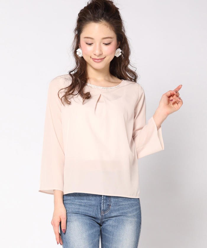 襟ぐりのさり気ないビジューが品良く華やかに仕上げてくれるブラウス。薄くて柔らかく上品なとろみのあるグレープデシンという素材でお作りしています。しなやかな風合いと微細なしぼ感が高級感のある印象を与えます。シルエットはソフトフレアスリーブで今年らしく仕上げています。デイリー使いから通勤まで幅広いシーンでお使いいただけます。