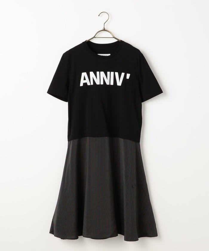 上下で質感が異なるコンビデザインのチュニック。トップはカジュアルなロゴデザインのカットソー、ボトムはストライプ柄の布帛を使用しています。まるで上下コーディネートしているような印象で、1枚で着映え力を発揮するアイテム。サイドのボタンを留めれば、動きのあるユニークなシルエットにシフトします。